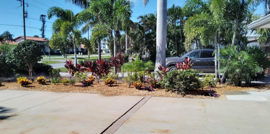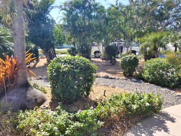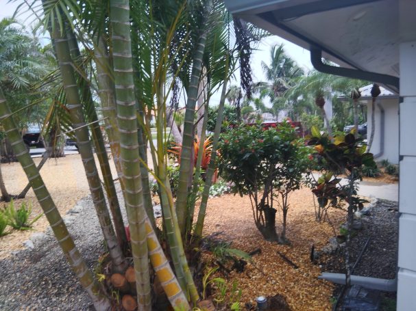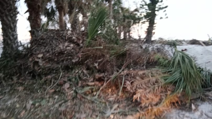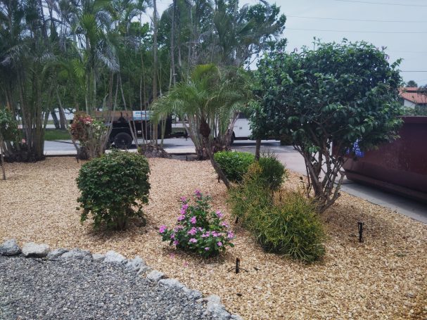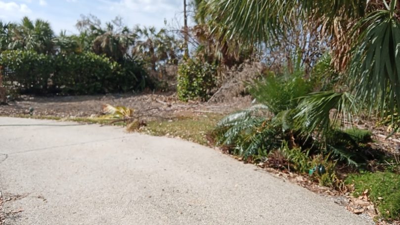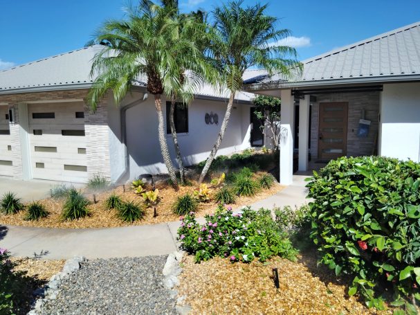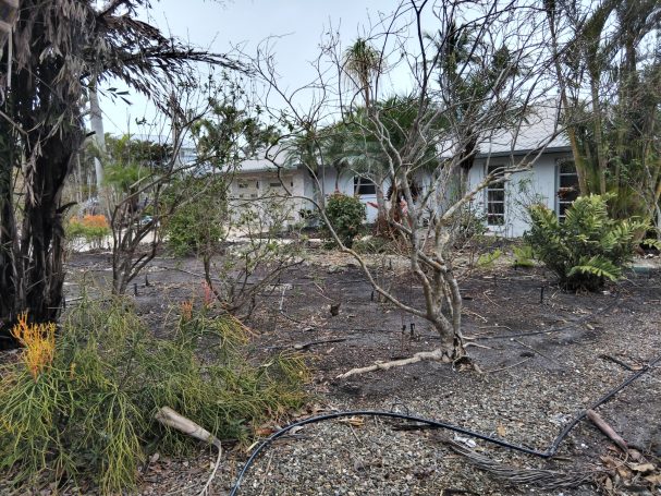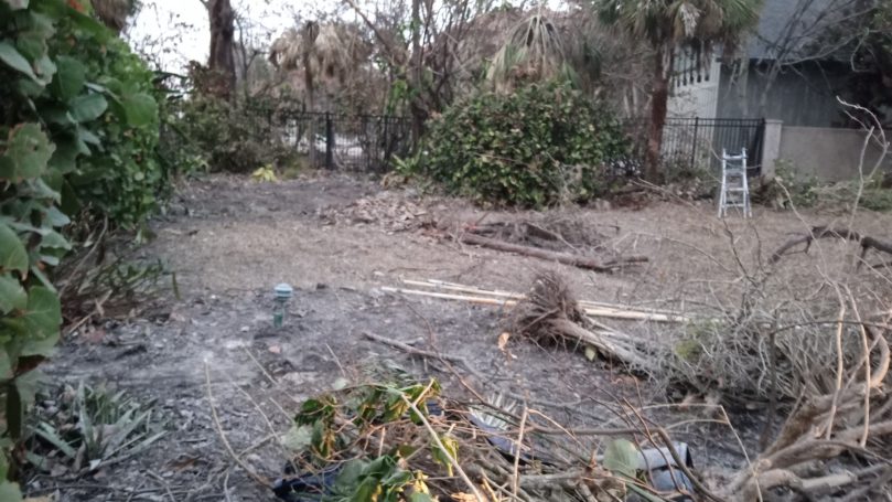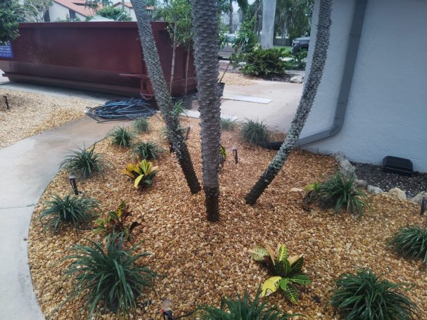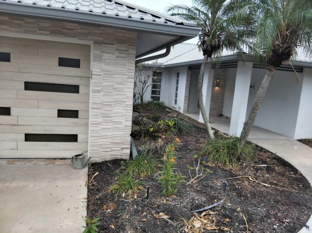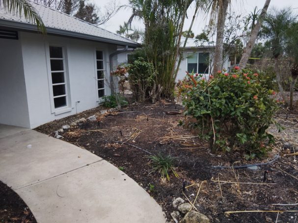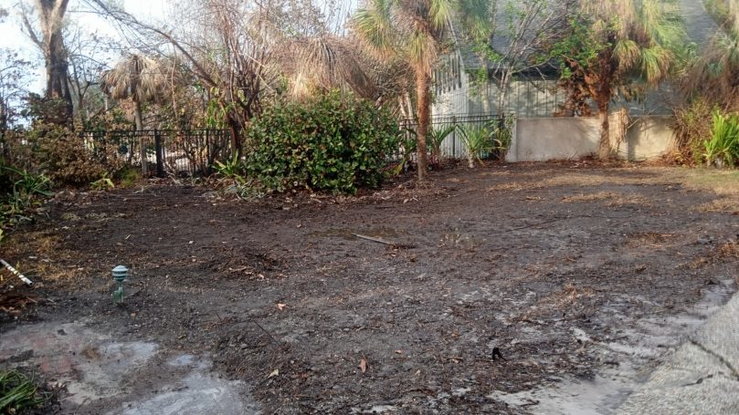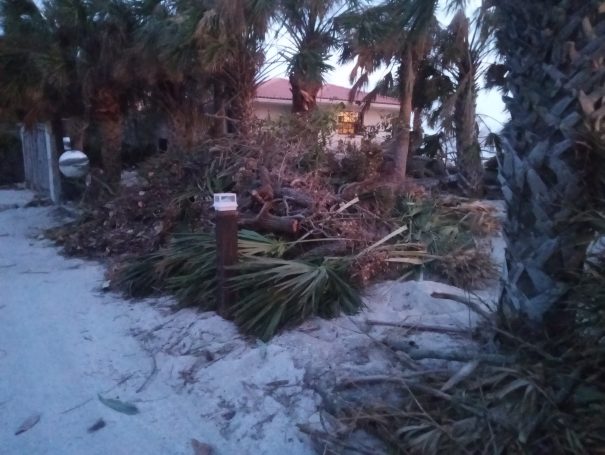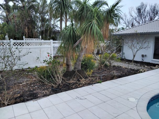 Fema had crews coming by to pick up everything that was piled up along the road but, nobody knew when, In order to get as much of the debris stacked by the road as we could, which was saving us dump runs, we first went through the property getting all the larger debris and then coming back after the debris pick-ups were finished and cleaning the smaller debris and any larger debris that we missed. After the back and the front north side were cleaned, we then graded the shrub beds then installed the areca palms and some plant material. The next step was final grading the areas to get re-sodded. We then installed the mulch and crushed shell where needed. We then laid the sod for the front, then moved to the gulf side to begin the cleanup.