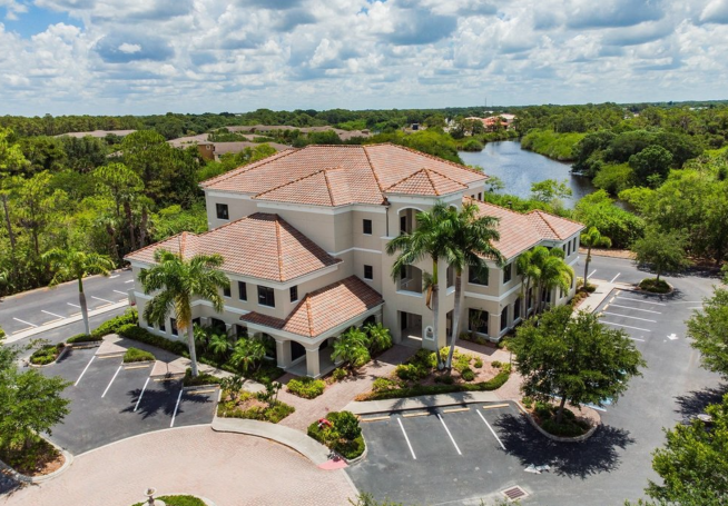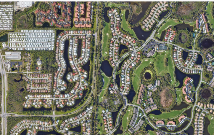 Office buildings, Roads, Medians, Homes and Apartment complexes.,