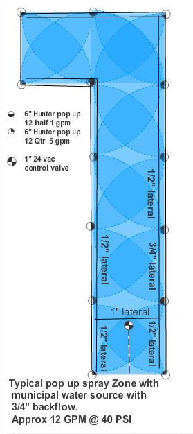 Below is a diagram of two typical r residential Rotor Zones. The Typical pricing for each type of commonly utilized irrigation zones are next to the diagram. On average, in Florida, four zones are typical for and average home, plus the mainline, clock and rain sensor. Generally a system consists of 1, low volume shrub zone, either one or two spray zones, one or two rotor zones and mainline.