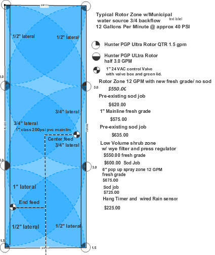 Below is a diagram of two typical r residential Rotor Zones. The Typical pricing for each type of commonly utilized irrigation zones are next to the diagram. On average, in Florida, four zones are typical for and average home, plus the mainline, clock and rain sensor. Generally a system consists of 1, low volume shrub zone, either one or two spray zones, one or two rotor zones and mainline.